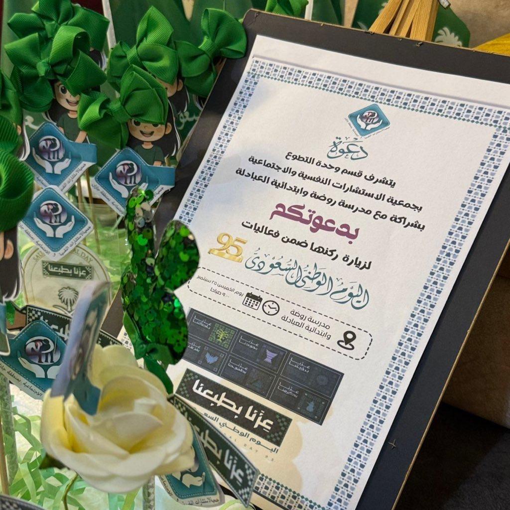 شاركت جمعية الاستشارات النفسية والاجتماعية بجازان ممثلةً في قسم التطوع في تفعيل احتفالات اليوم الوطني السعودي الـ95، وذلك بالشراكة مع مدرسة روضة وابتدائية العبادلة، حيث قام بتنفيذ الفعالية مجموعة من متطوعي الجمعية.